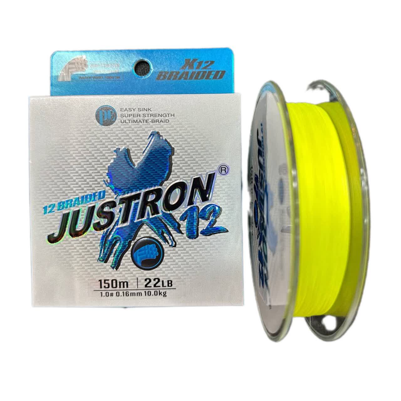 | Justron 12X | براید (Braid) | 0.16 mm | 10 kg | 150 m | سبز فسفری (Fluorescent Green) | 12 رشتهای (12X) | پلیاتیلن با چگالی بالا (PE) |